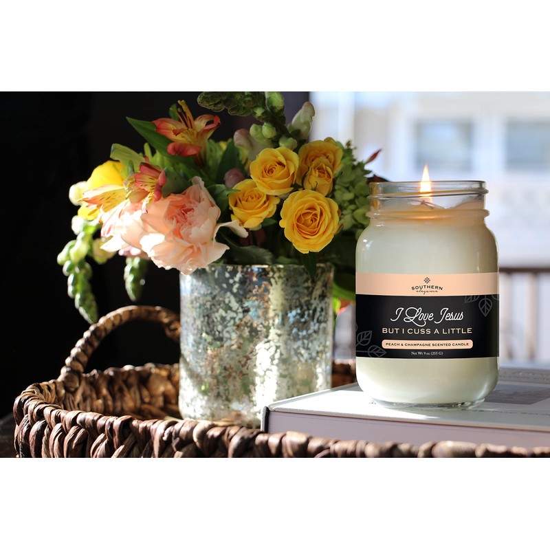 Southern Sayings by Southern Elegance | I Love Jesus, but I Cuss A Little (Peach & Champagne) Scented Candle | 9 oz | Handcrafted in the USA| Highly Fragrant