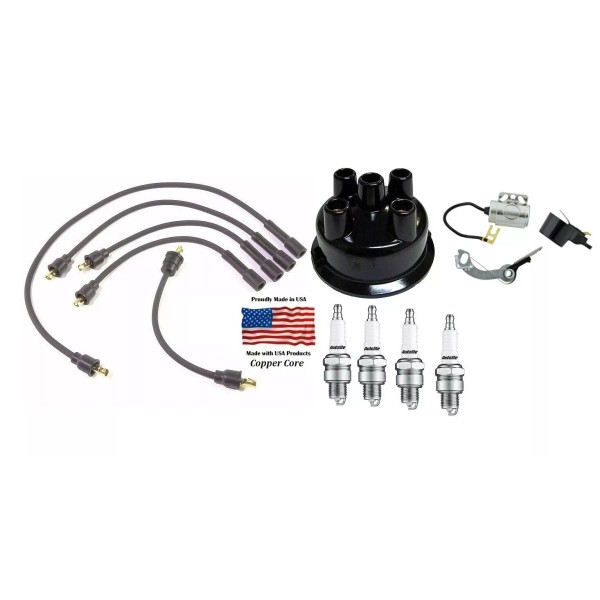 Autolite / Prestolite Distributor Ignition Tune up kit: USA Made Distributor Cap, Points, Condenser, Rotor, Custom USA Made Spark plug wire set, 4 Autolite 216 Spark Plugs