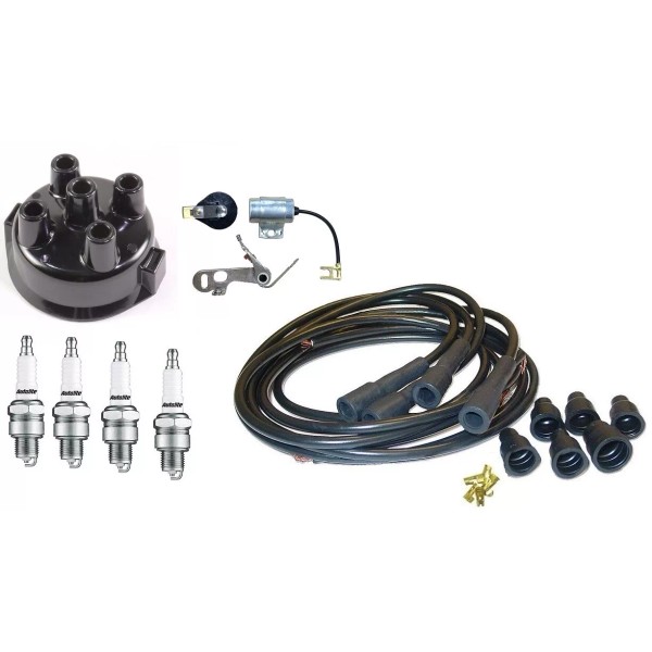 Delco Clip-held Distributor Ignition Tune up kit: USA Made Distributor Cap, Points, Condenser, Rotor, USA Made Copper Core Spark plug wire set, 4 Autolite 405 Spark Plugs (14mm x 3/4" reach)