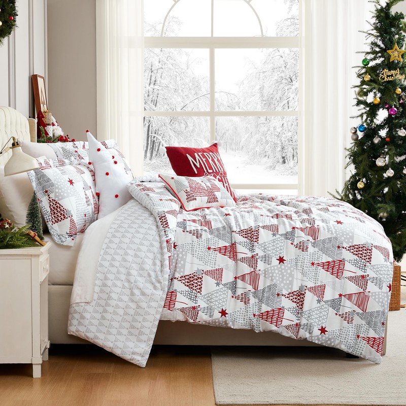 - TRANSFORM YOUR BEDROOM INTO A COZY CHRISTMAS RETREAT: Christmas tree themed twin size bed comforter set featuring geometric Christmas tree art one side and a subtle tree pattern on the other. Christmas throw pillows and holiday pillow shams top off the look.