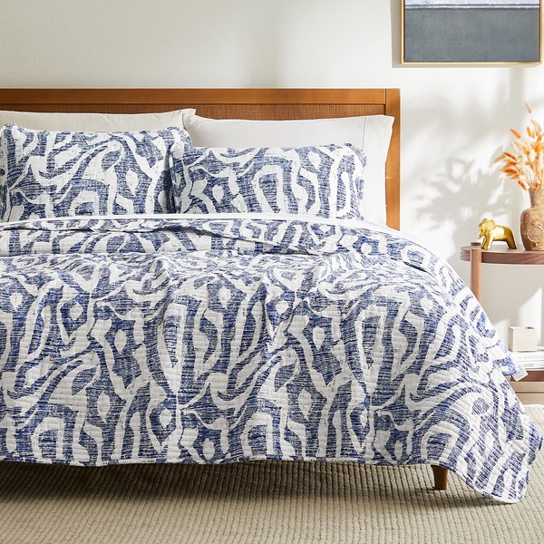 Southshore Fine Living, Inc. Khari Oversized Queen Quilt Bedding Set, 3-Piece Lightweight Coverlet and 2 Matching Pillow Shams, Indian Hand Printed Tapestry Style, Quilt Full Size Bed Set, Blue