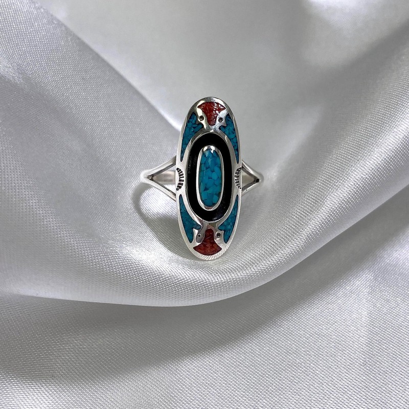 Southwestern Style Turquoise & Coral Gemstone 925 Sterling Silver Ring 7
