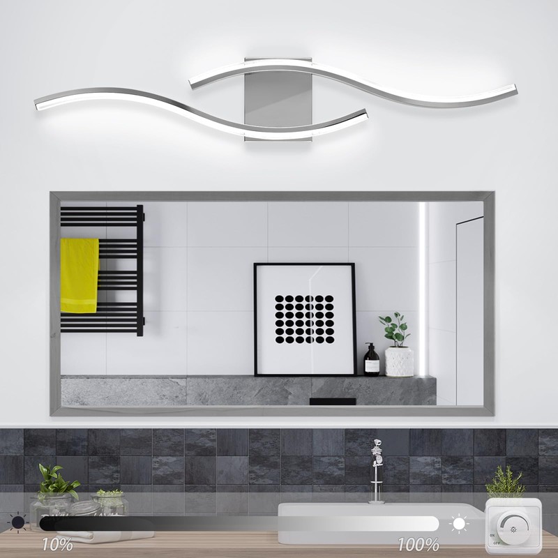 - Modern design: The modern vanity light adopt a design concept that combines chrome tones and wavy shapes, which is simple yet elegant. The chrome vanity light uses a color temperature of 6000K. Dimmable modern bathroom light are dimmable via a dimmer switch, with a 10%-100% dimming range, and measure 33.5 inches (length) x 5.9 inches (width) x 2inches (height), has a power of 26W, and operates on 110V