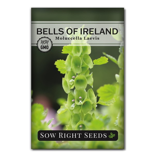 - Beautiful - Full color seed packet of Bells of Ireland flowers (Moluccella laevis). This interesting annual variety has spikes of green bell-shaped calyxes around tiny white and lavender flowers. Minimum of 750 mg per packet (about 110 seeds)