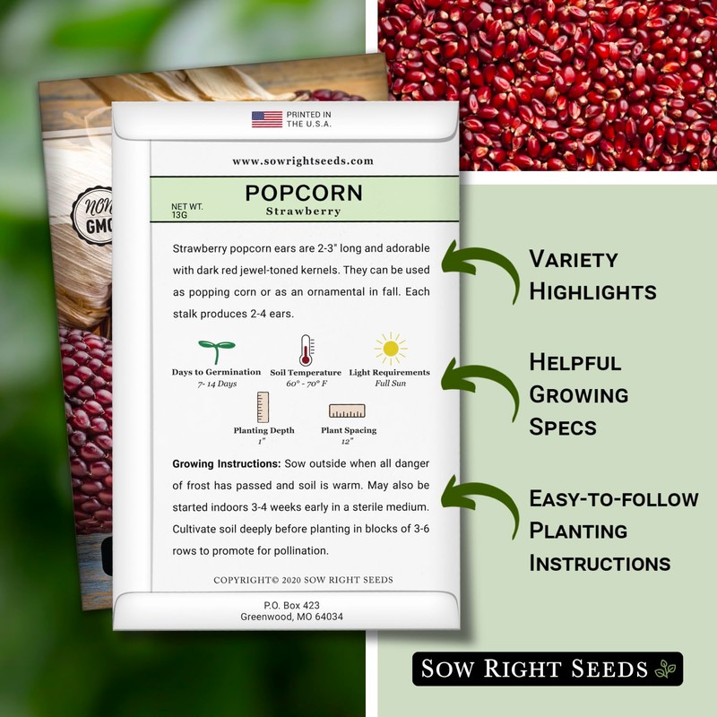 - Beautiful - Large premium packet of Strawberry Popcorn seeds (Zea mays). The beautiful ears of corn can be used as popping corn or as an ornamental in fall. Minimum of 13g per packet (about 135 seeds).