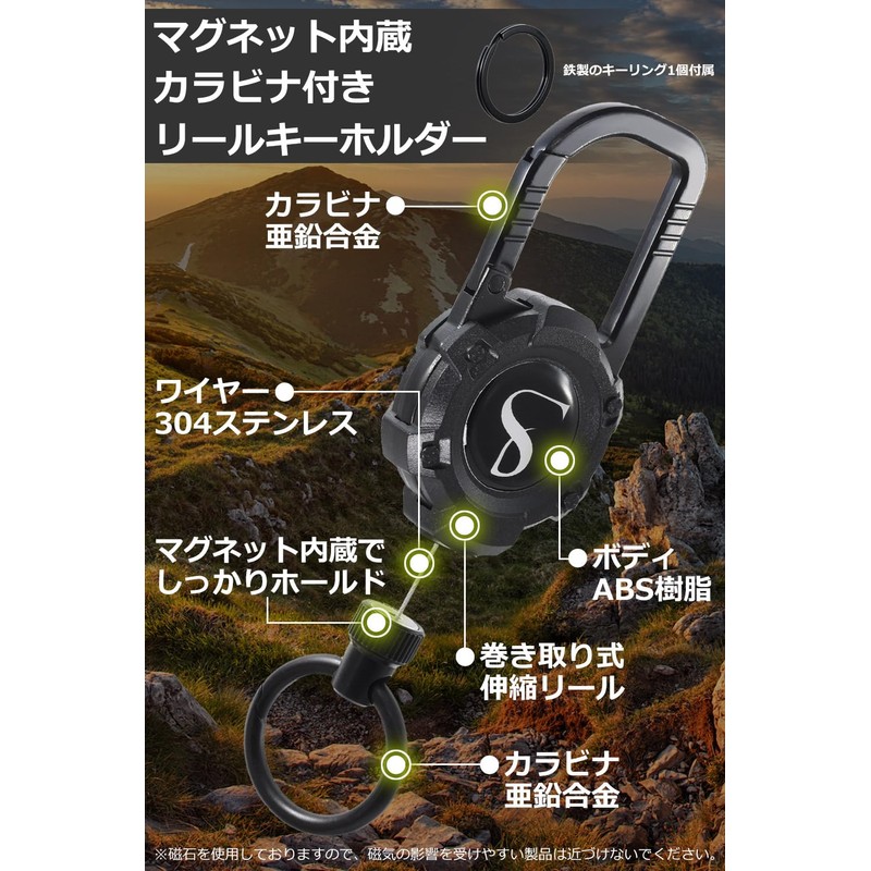 [SOY'S F] Reel Keychain with Carabiner Key Reel, Strong Magnet, Reel Strap, Keychain, Metal Wire, Expandable Keychain (Black)