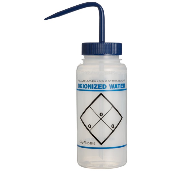 SP Bel-Art Safety-Labeled 2-Color Deionized Water Wide-Mouth Wash Bottles; 500ml (16oz), Polyethylene w/Blue Polypropylene Cap (F11646-0631), Natural, (Pack of 6)