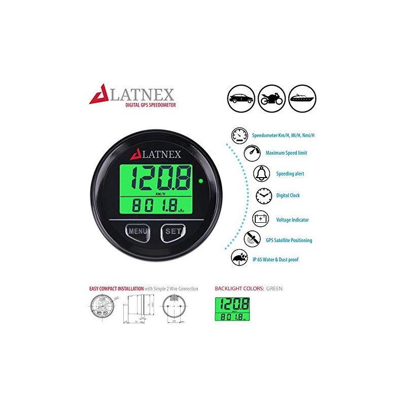 LATNEX Waterproof Digital GPS Speedometer Backlight for ATV UTV-MARINE-Boats-Motorcycle- Automobile Motor Vehicle Bikes can be used to test the driving speed (accuracy is1km/h) and driven distance.