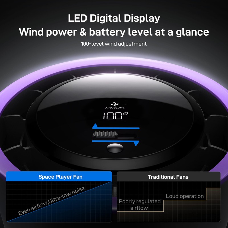 - 【Smart Dial: Rotate to adjust wind speed】The switch is an LED black screen. Rotate the dial to activate the fan and control wind power. Integrated metal crown with built-in LED display shows real-time wind speed levels (1-100) and battery percentage (1% accuracy)