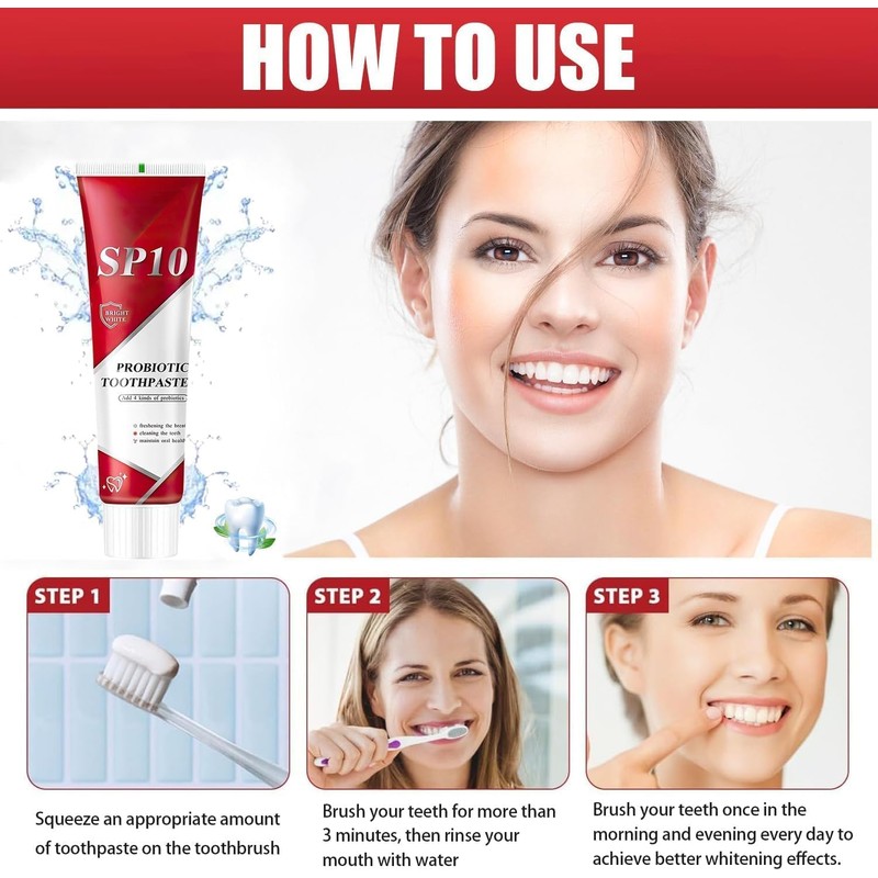 - Note: After receiving our SP10 Probiotic Whitening Toothpaste, please open the package and check it in time. Our package is 1 color box with 2 100G toothpastes. Please refer to the actual product packaging photos attached in the link, and wish you a happy shopping!