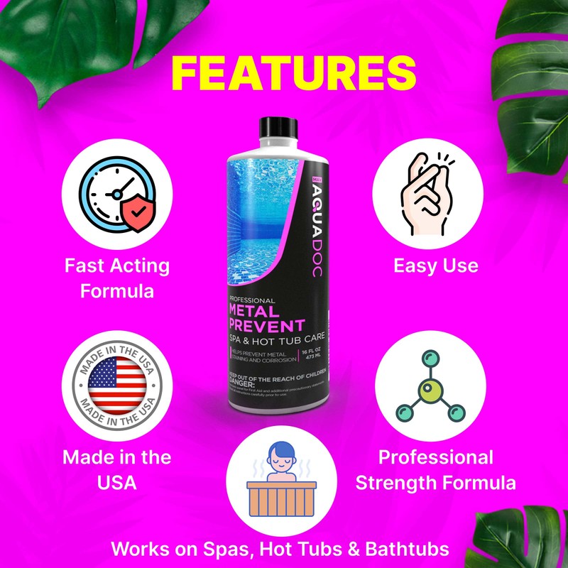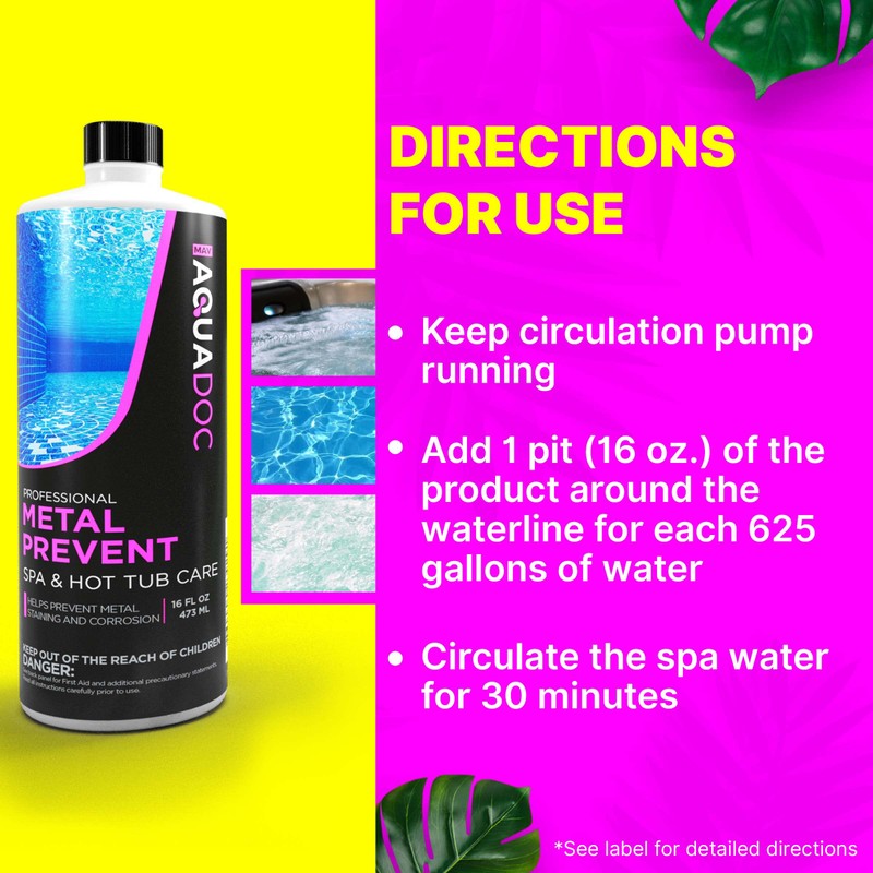 How to use AquaDoc Metal Prevent - Using our spa metal prevent chemical is easy. Simply keep the circulation pump running and add 1 pint (or 16 fl oz) of our metal control liquid around the waterline for every 625 gallons of water. Once added, circulate the spa water for 30 minutes. Then enjoy metal free hot tub water at your leisure.