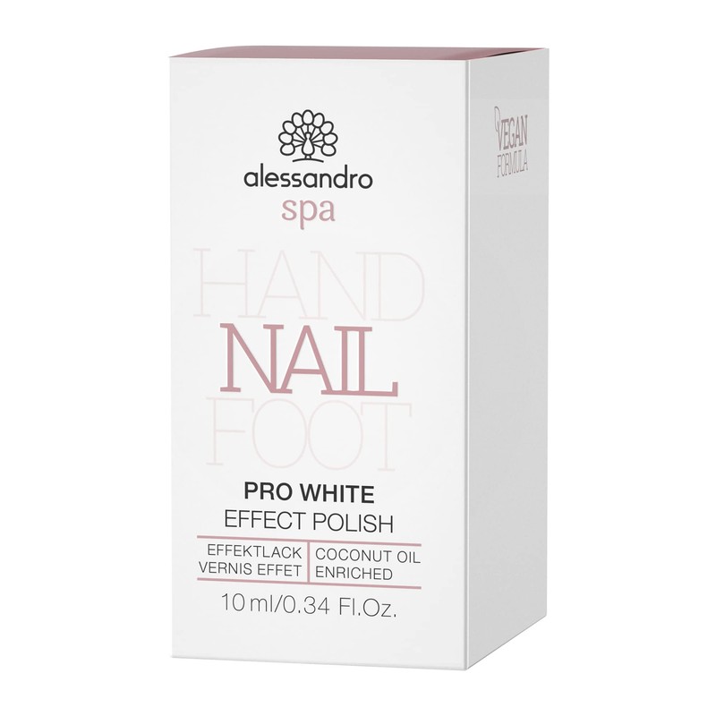- Box contents: 1 x 10 ml alessandro Spa Pro White Effect Nail Polish with Anti-Yellow Formula / with Coconut Oil