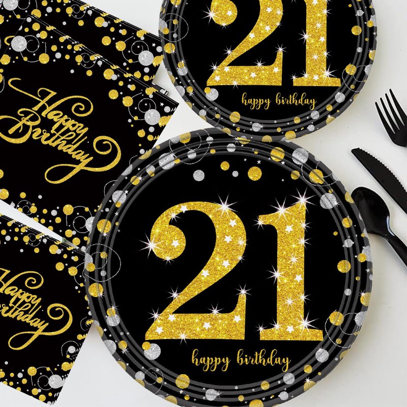 SPABOY Black and Gold 21st Birthday Party Napkins and Plates, Decorations for Her/Him, Tableware Set for 16 Guests