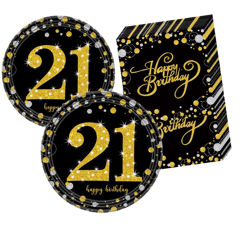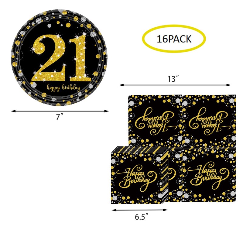 - 1.Quantity: Total 16pcs 21st Happy Birthday Napkins and 16pcs 21st Birthday Plates,Gold and Black Color.