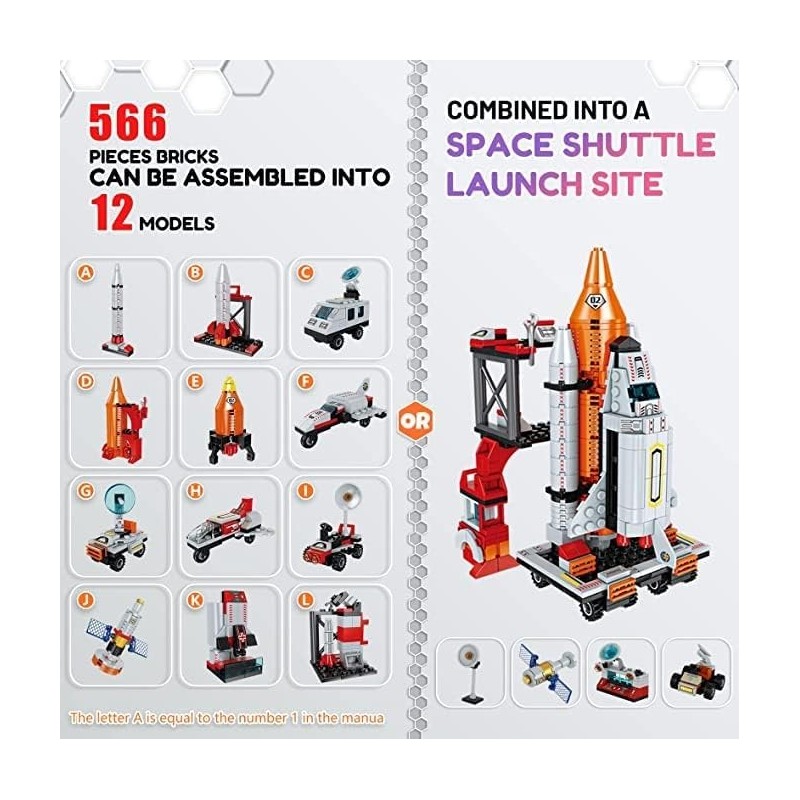 [12-in-1 Space Toy Building Block Set] - 566PCS of the STEM Toy can be build into 12 space vehicle models, such as space shuttle, satellite, rockets and vehicles. Build the blocks with your child and enjoy a happy parent-child time.