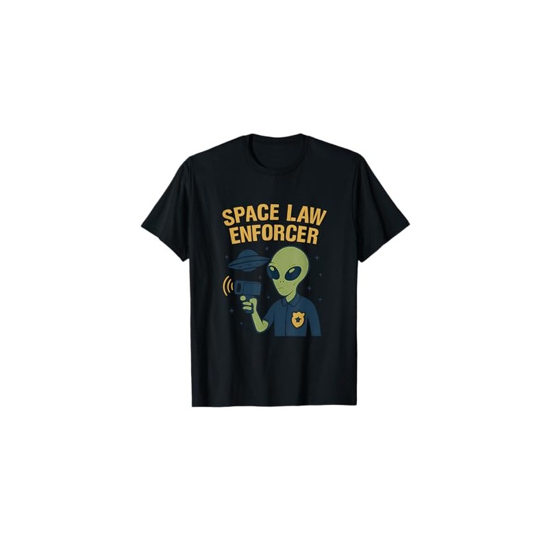 • Cartoon alien with official badge and radar gun in bold yellow and navy blue on black. Police stencil font proclaims Space Law Enforcer. Fun UFO graphic for UFO lovers, space cops, sci fi fans, space humor, alien patrol, galactic guard.