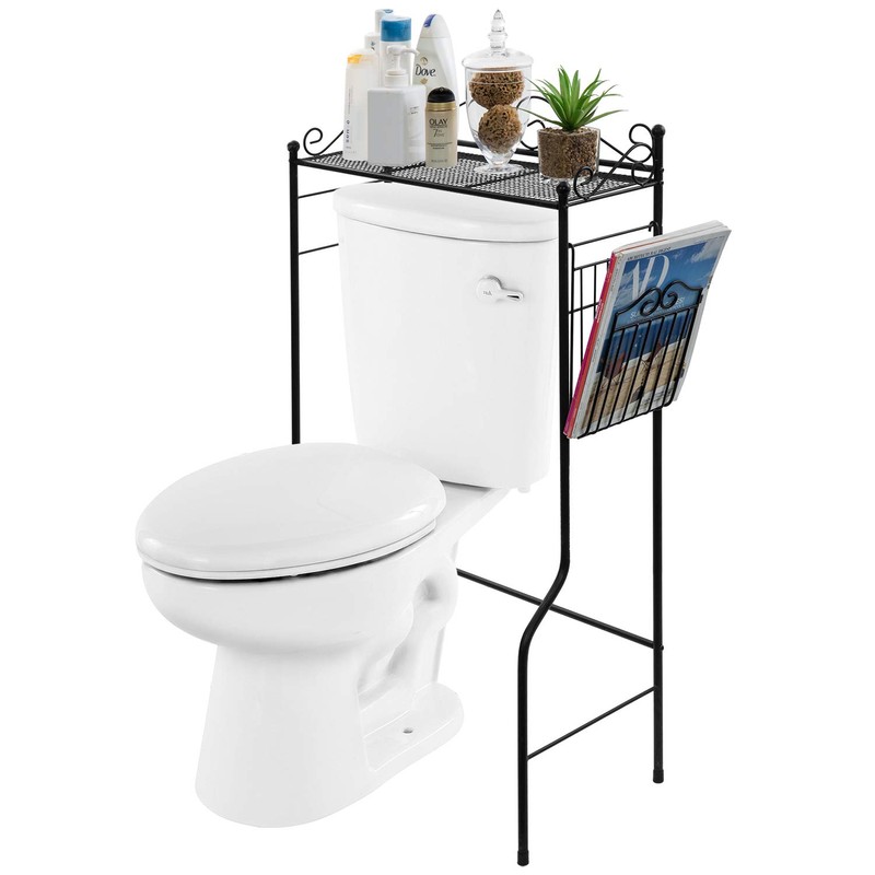 MyGift Black Metal Over The Toilet Standing Shelf with Vintage Scrollwork Accents and Magazine Basket, Freestanding Bathroom Space Saver Organizer Rack