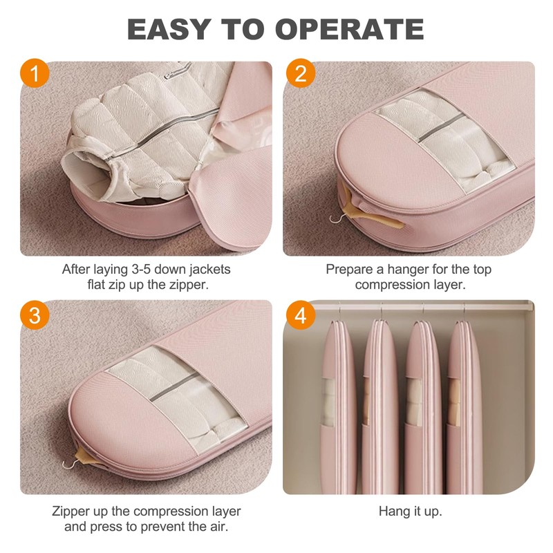 - Tidy Closet Space:Space Saving Hanging Clothes Bag with self zipper. One hanging vacuum bag can store up to 5 pieces of clothing, including winter jackets, suits and coats, and reduce their original size, making more room in your wardrobe for new clothes