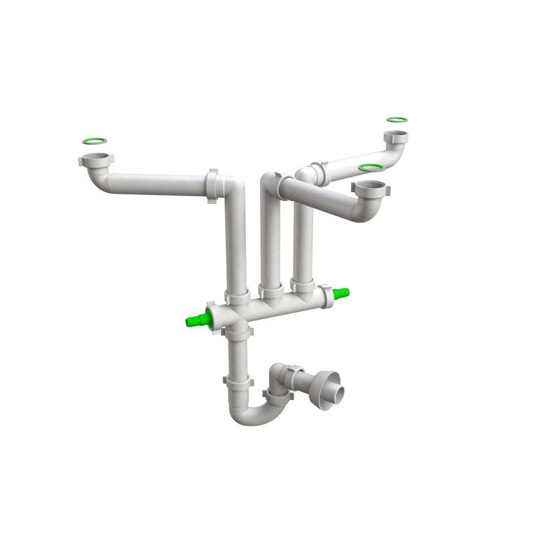 - Space-saving siphon for the kitchen sink space 3. Many high-quality and durable sanitary products to complete the installation of your sink and make it functional. The Space3 space-saving siphon is suitable for kitchen sinks with three bowls. The structure is made of white PP polypropylene. Drain connection 1 inch 1/2 drain 40 mm 3 inlets, 2 auxiliary connections KVstore, the expert in bathroom fittings, selects its sanitary products carefully