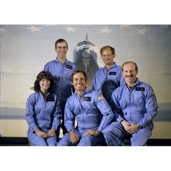 Astronauts of the STS-7/Challenger mission are left to right first row: Sally K. Ride (mission specialist), Robert L. Crippen (commander), Frederick H. Hauck (pilot); rear row: John M. Fabian (left) and Norman E. Thagard (mission specialists). STS-7 launched the first five-member crew and the first American female astronaut into space on June 18, 1983.