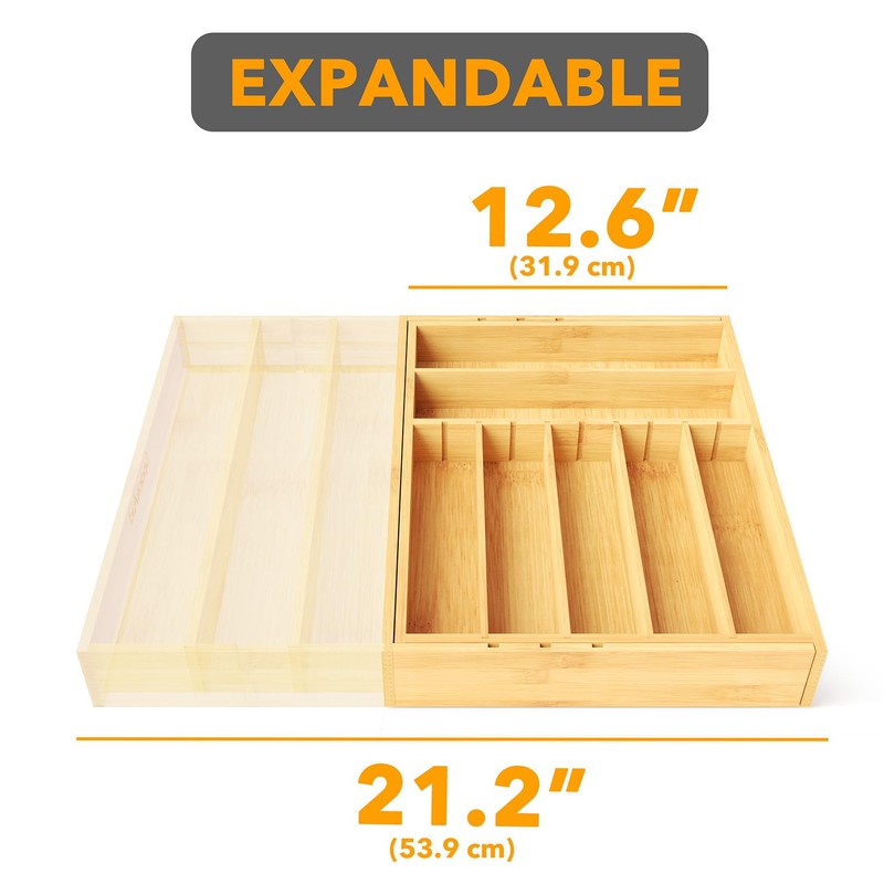 - ORGANIZED AND BEAUTIFUL - Make your kitchen drawer neat and organized with bamboo silverware organizer. The utensil organizer is designed for your different silverware kitchen storage organization; SIZE: 16.9"L x 12.6"-21.2"W x 2.5"H