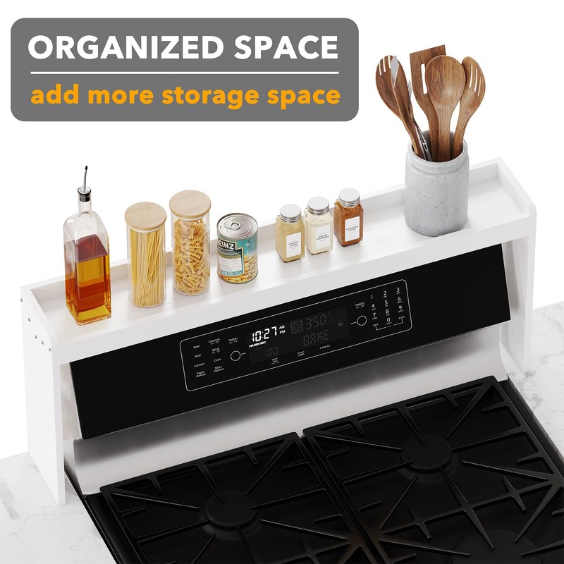 - ORGANIZED AND BEAUTIFUL - Make your kitchen stove neat with bamboo white stove holder top organizer; The rack is designed for giving extra space over oven; Shelf SIZE: 32.5"W x 5.5"D x 13.8"H