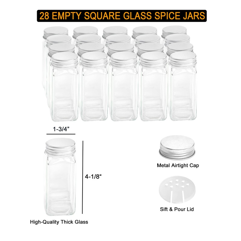 - 20 Glass Spice Jars - Made of lead-free durable glass; Feature sift and pour lids allow you either shaking or measuring with spoons, metal airtight caps keep your spices stay fresher longer; The funnel makes adding spices mess-free