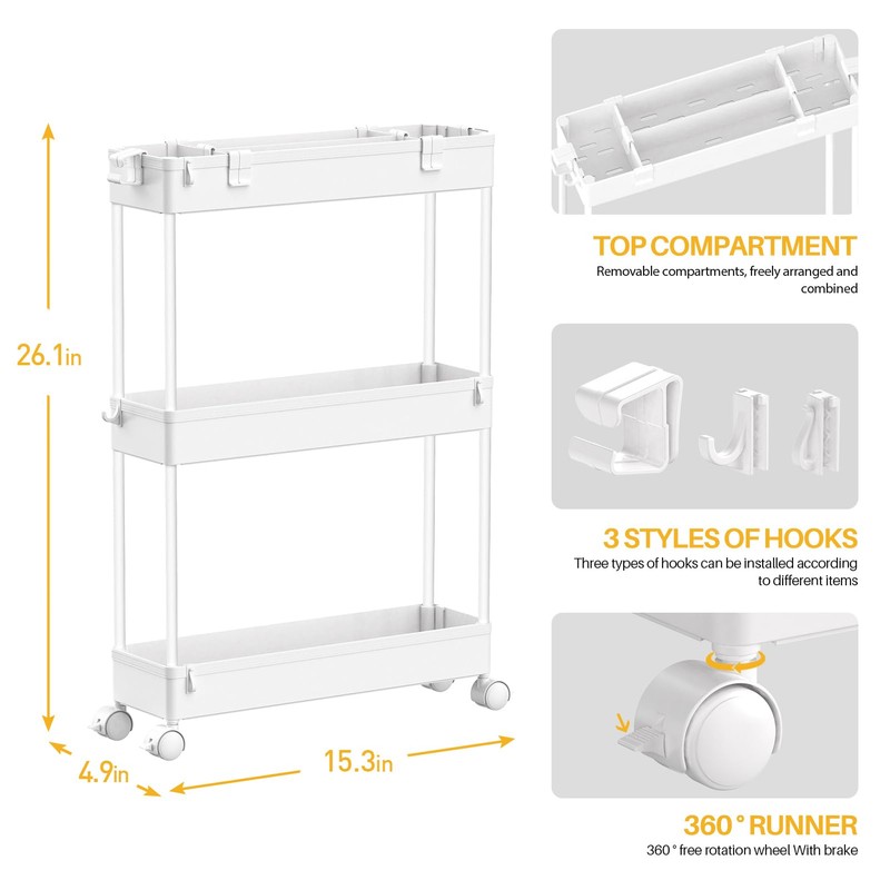 • Multifunctional Storage Cart: Rolling storage utility cart is not just a cart, it can be adjusted to 2 or 3 layer shelf after removing the casters. The partical small utility cart can be used as bathroom dresser, kitchen spice rack to keep your space organized.