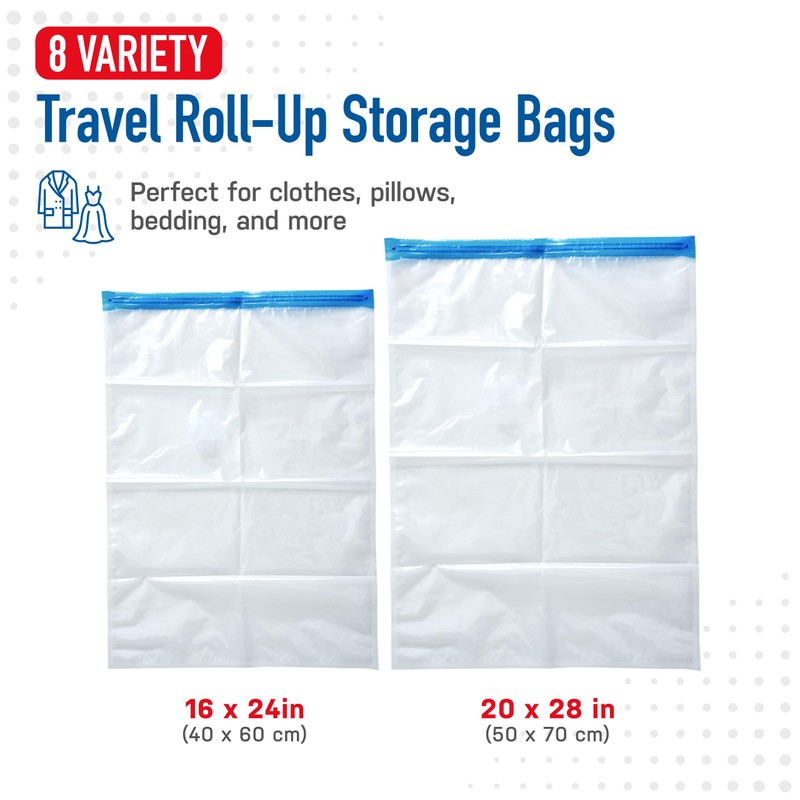 • EASY TO USE: If you’re travelling and want the MOST out of your suitcase space, these storage bags are PERFECT! Pack your suit case with ease, and dont leave a thing behind with the airline compression bag, and when you have to re-pack for the return trip, there's no pump required! Simply roll up and seal! Rolling out air on the Space Saver bags for travel reduces the size of items up to 80% leaving extra space in your suitcase!
