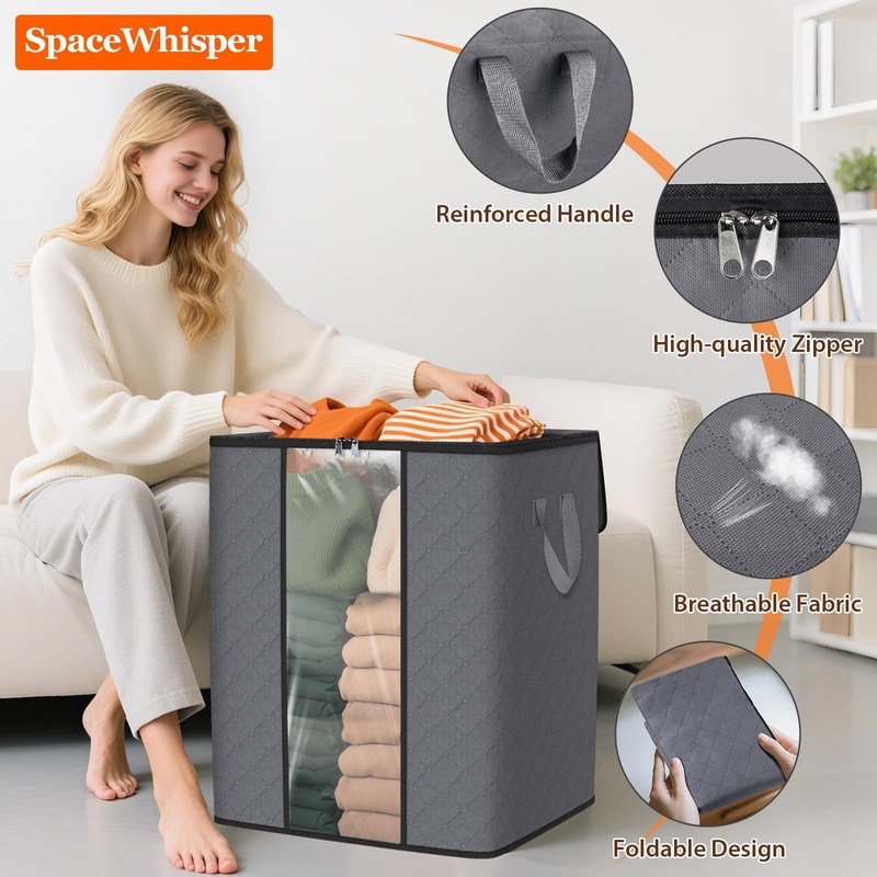 SpaceWhisper 8 Pack 100L Clothes Storage, Foldable Thick Fabric Blanket Storage Bags, Containers for Organizing Bedroom, Closet, Clothing, Comforter,Closet Organization with Handle,Grey