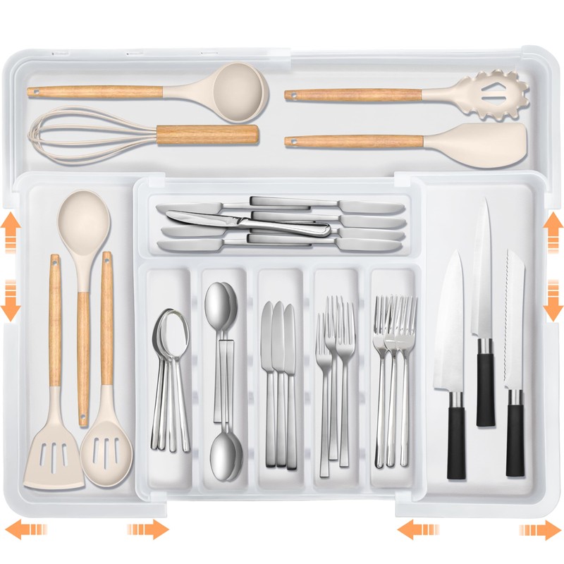 This versatile expandable and adjustable silverware organizer creates order out of any cutlery chaos.