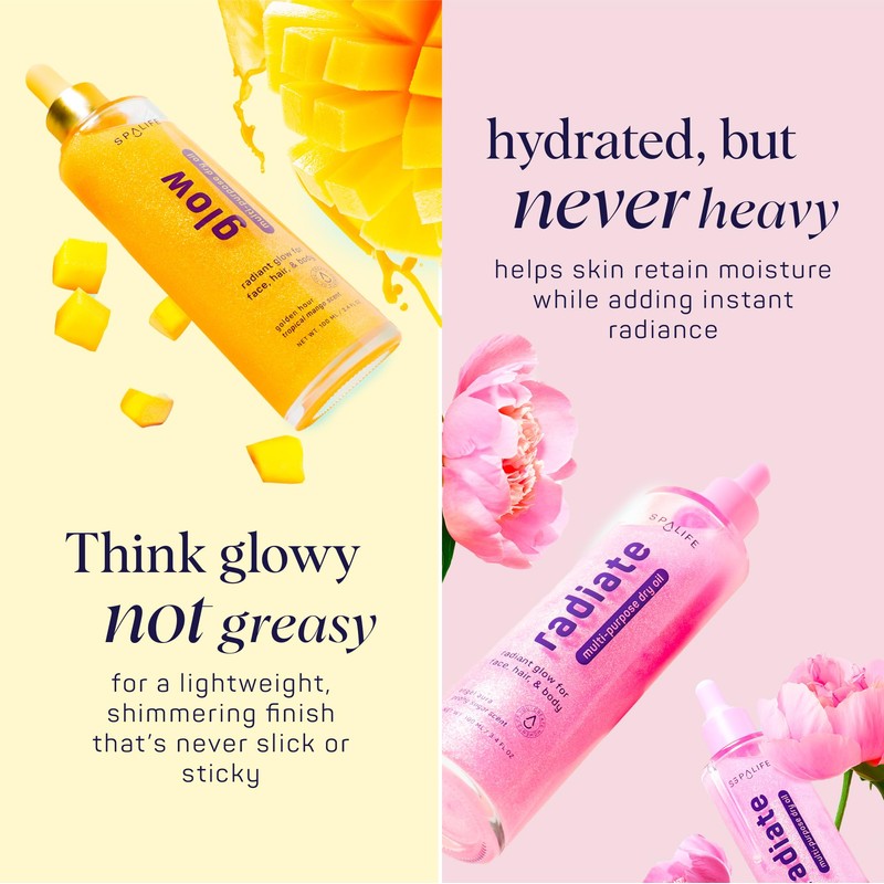 SpaLife Beauty Radiate & Glow Shimmer Oil Bundle – Dry Oil Duo with Subtle & Noticeable Shimmer – Mango & Peony Scents – Hydrating, Lightweight Moisture