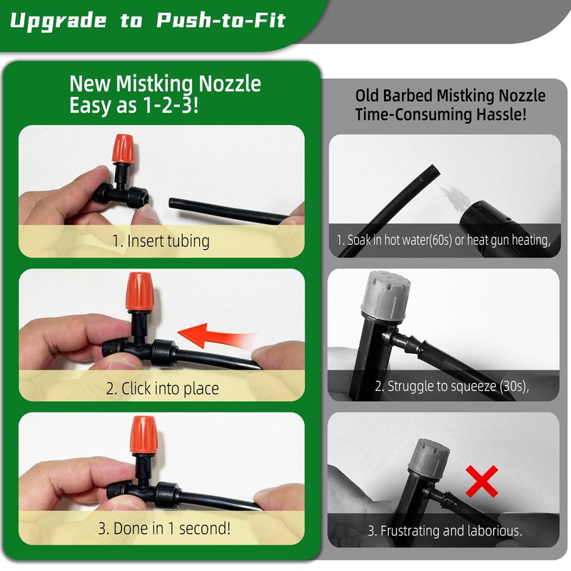 - Effortless Installation: Our push-to-fit 1/4" mist sprinkler heads feature a two-way quick-connect design, eliminating the need for hot water softening or heat gun heating. With one-step installation that takes just 1 second, you can simply plug and play for efficient watering in your lawns, home gardening, terraces, patio, roof cooling, balcony cooling, plant watering, greenhouse vegetable and humidification, aeroponics,irrigation etc. !!! CHOOSE drip irrigation emitters FROM 【Spalolen】!!!