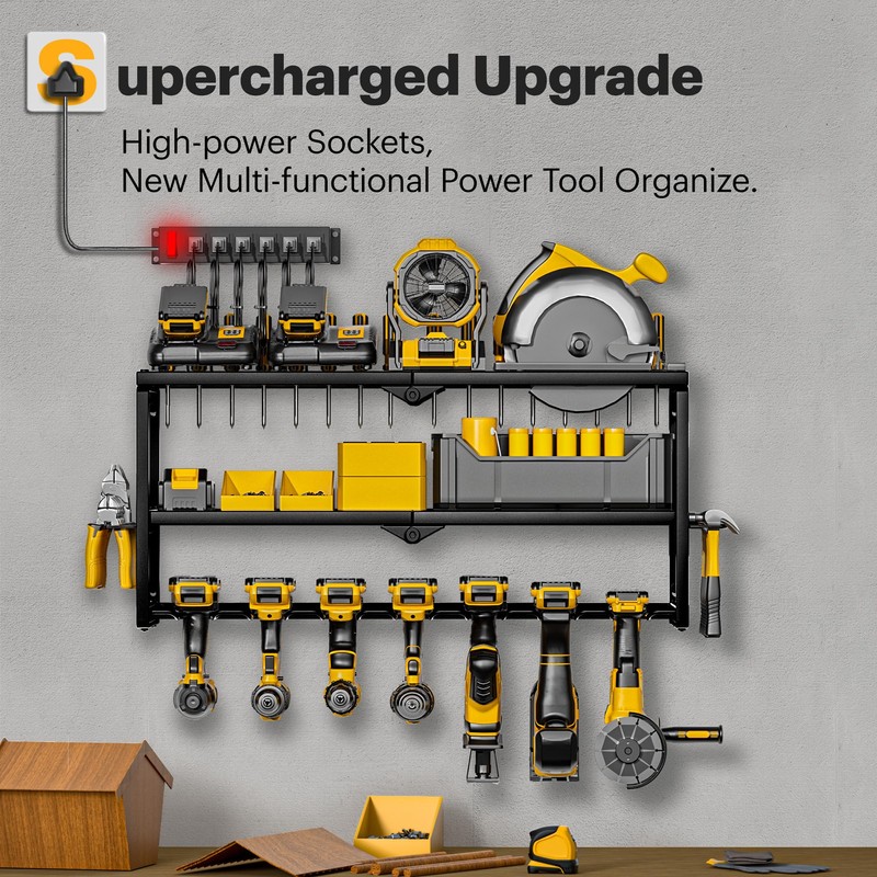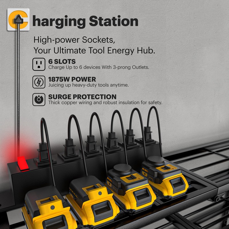 - Power Tool Organizer with Charging Station: Equipped with 4-6 outlet power strips, it offers great convenience for charging your tool batteries. You can charge everything on the tool rack, eliminating the need to search for sockets and enhancing work efficiency