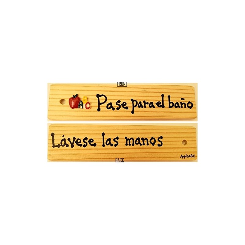 Spanish Bathroom/WASH Your Hands Pass on Front & Back - AA-911 SW Made in USA - 8"x2" Wooden Pass w/ABC Logo & Hang Loop.