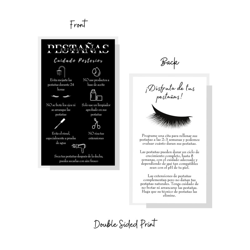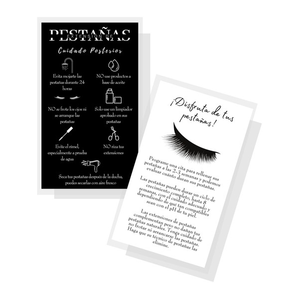 This listing product includes physical printed cards. Size is 2 x 3.5" inches each business card is printed on thick premium 14 pt. matte card stock. This card is printed front and back in Spanish with Lash Extension aftercare instructions on the front and answers to Lash Extension FAQs on the back.