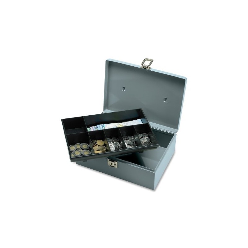 Cash box features a latchkey lock and seven-compartment tray to safeguard your money and other valuables. Removable seven-compartment tray allows storage underneath. Tray has one long compartment for cash and six smaller compartments for coins and other items. Steel construction includes heavy-duty steel hinges. Cash box includes two keys.