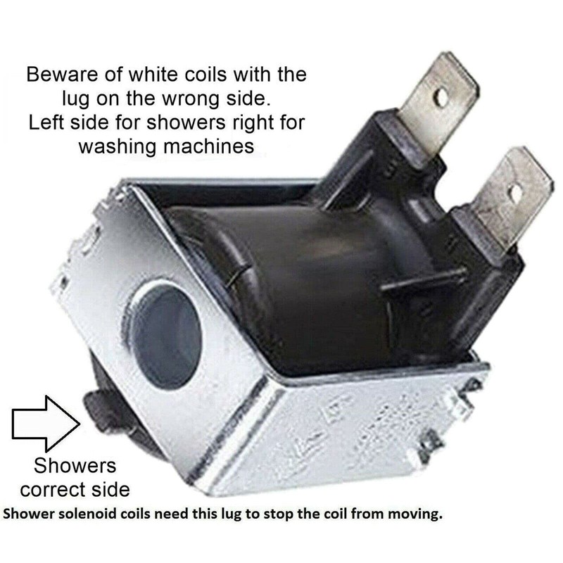 - Solenoid coil - restores the water flow for the vast majority of all electric / power showers -- Height: 30mm -- Lug on left side for showers to stop coil from moving