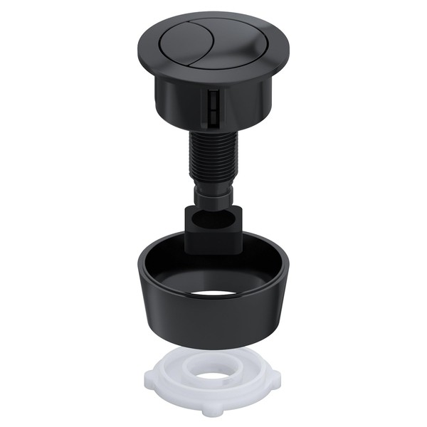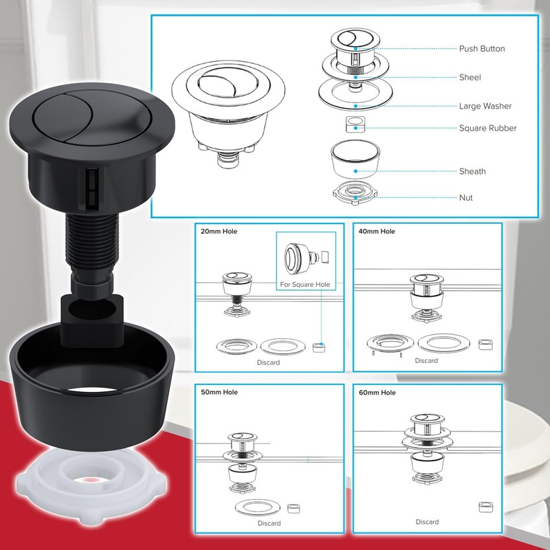 Premium quality replacement dual flush button kit for use with many brands and models of toilet cisterns with a 20mm, 40mm, 50mm or 60mm lid hole using a 16mm thread box cable operated flush valve. In luxurious matt black, this kit contains all necessary components for installation and adaption to a variety of cistern lid hole sizes - with fully illustrated instructions for easy fitting.