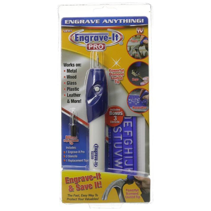 Engrave your personal property yourself-safely and easily-and protect valuables against theft. Engrave-It easily etches metal, wood, glass, leather, plastic and more. Includes the Engrave-It unit, 3 hard plastic stencils of letters, numbers and shapes and a BONUS replacement tip FREE. On/off switch. Uses 2 AA batteries (not included). 7"L. Engraves On: Metal Glass Plastic Wood And more!.