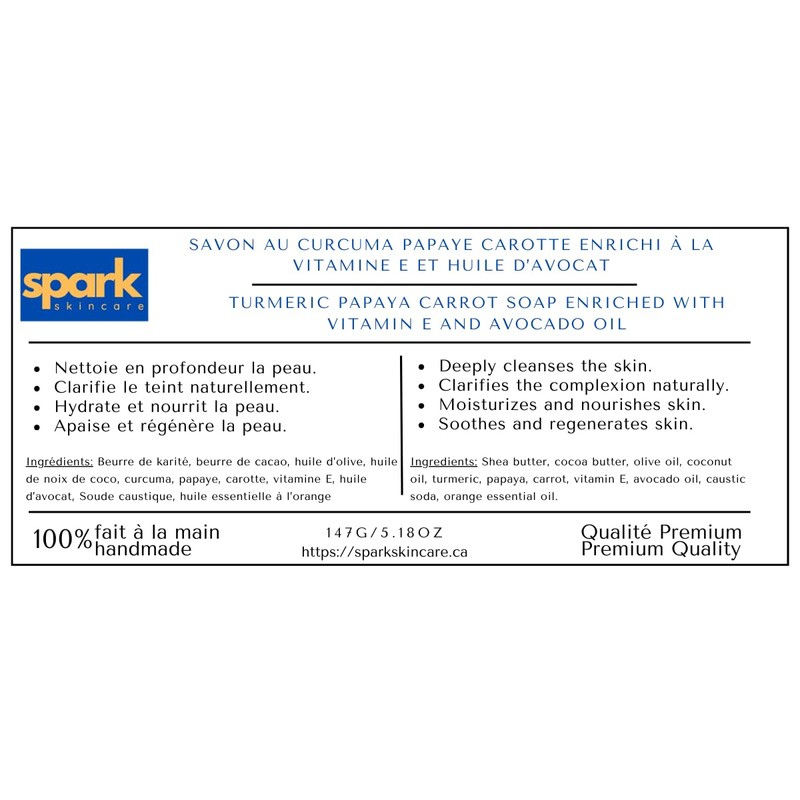 Spark Skincare | Papaya & Carrot Turmeric Soap Enriched with Avocado Oil and Vitamin E for Men and Women, Anti-Blackspot Soap, Natural & Organic Soap, Shower Bar, Moisturizing Soap for Sensitive Skin, Handmade Soap