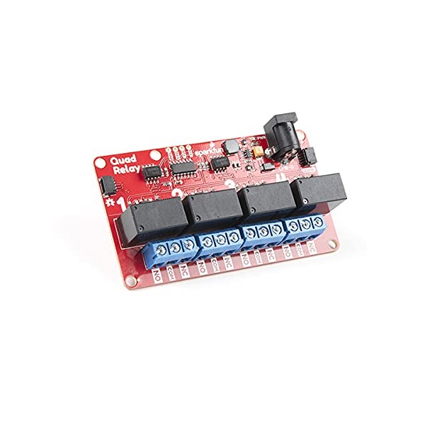 The SparkFun Qwiic Quad Relay is a unique power accessory board that has been designed for switching not one but four high powered devices from your Arduino or another low powered microcontroller using I2C. Taking a look at the board, the Quad Relay has four individual relays rated up to 5 Amps per channel at 250VAC or 30VDC. Each channel also has its own uniquely colored LED, silk for easy identification, and screw terminals for optional connection. Utilizing our handy Qwiic system, no soldering is required to connect it to the rest of your system!