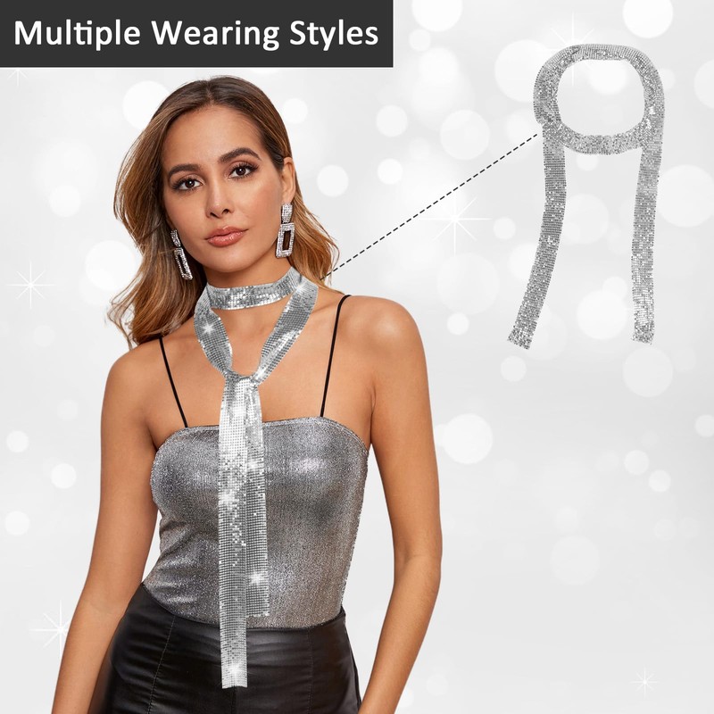Sparkle Sequin Scarf for Women, Metal Sequin Scarf Glitter, Abba Outfits for Women Accessories, Skinny Neckerchief (Silver+Gold)