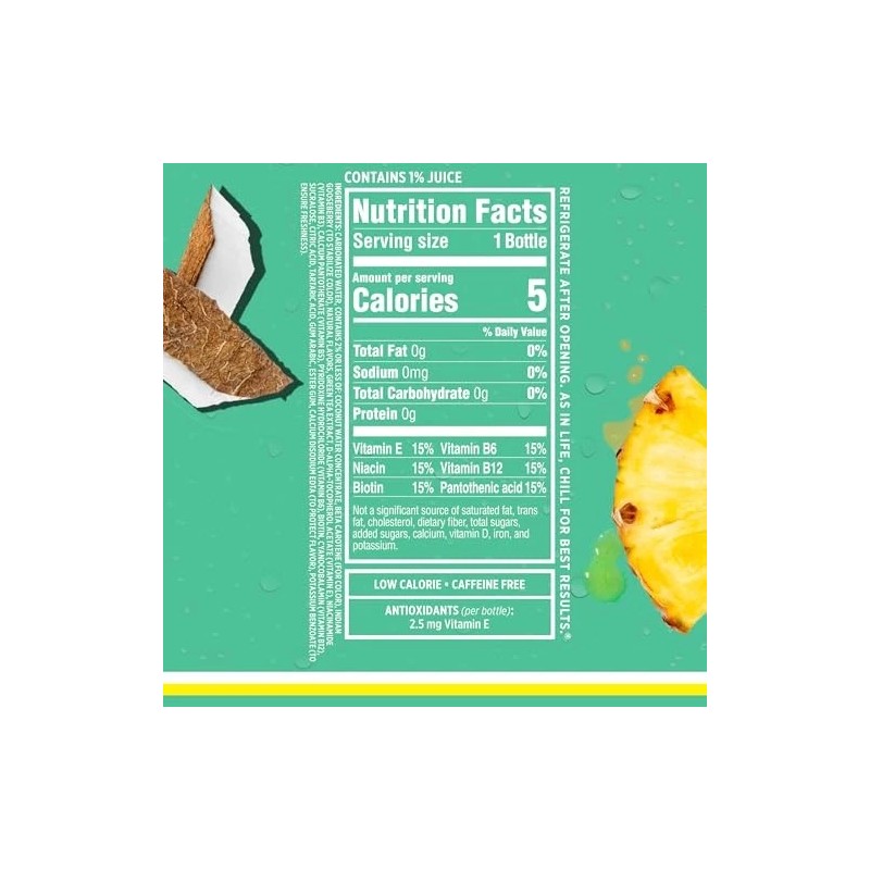 Product DescriptionTransport yourself to the beach with tropical pineapple and tantalizing coconut flavor. Sparkling Ice Coconut Pineapple is a fizzy, flavorful sparkling water, without all the calories. Sparkling Ice Coconut Pineapple flavored sparkling water contains 0g sugar, only 5 calories per bottle, and 0g carbs. Made with better-for-you ingredients, this low-calorie carbonated water is bursting with real fruit flavor, is made with colors from natural sources, and contains vitamins and antioxidants. Enjoy Sparkling Ice as a mocktail or mix it with your drink of choice for a delicious, low calorie cocktail. The product ships in a pack of 12 bottles. Each sparkling water bottle contains 17 fl oz.Manufacturer Contact InformationTalking Rain Beverage Company P.O. Box 549 Preston, WA 98050