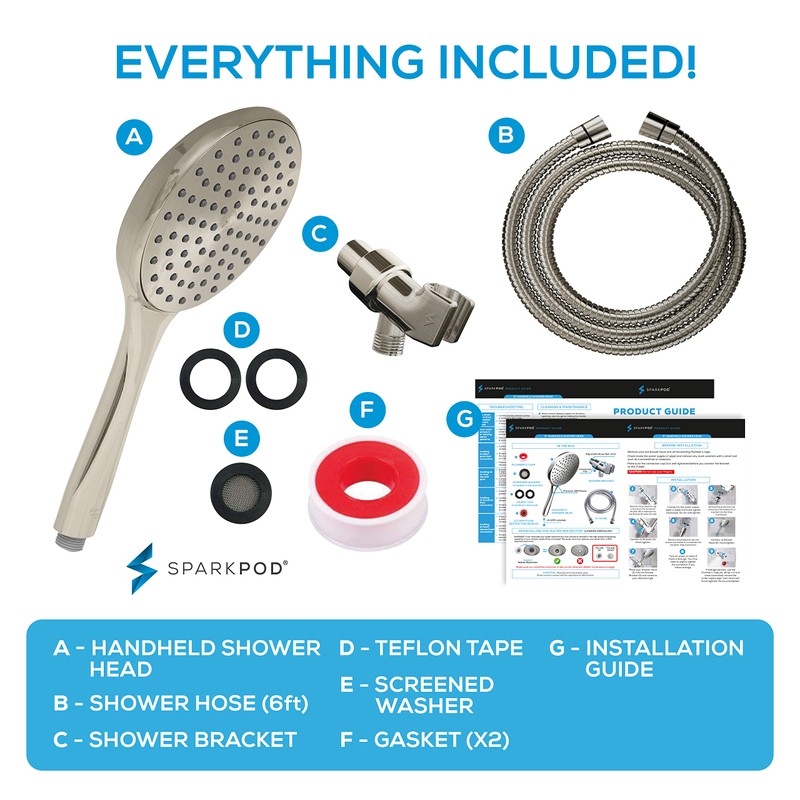 - The SparkPod shower head boasts an elegant brushed nickel finish with a unique, adjustable brass swivel ball joint overhead bracket for easy maneuverability and optimal positioning