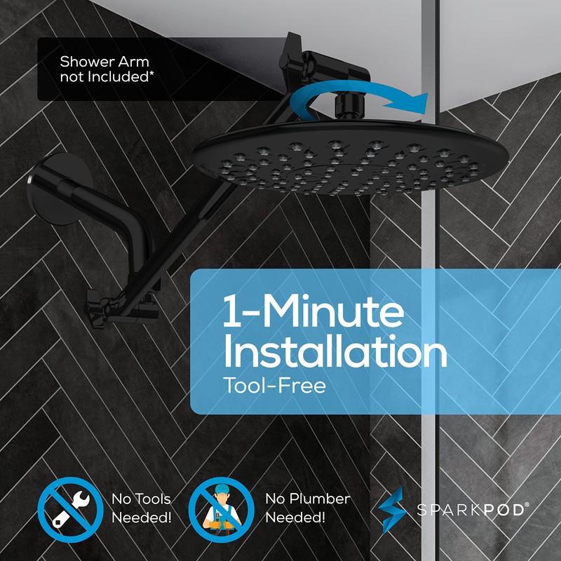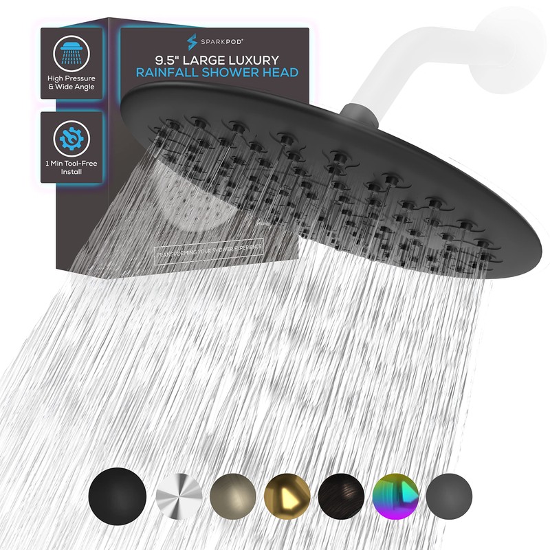 SparkPod 9.5 Inch Large Rain Shower Head - Luxury Rainfall Shower Head - High Pressure Showerhead, Full Body Coverage with Anti-Clog Silicone Nozzles - No Hassle, Easy Install (1/2 NPT, Black Matte)