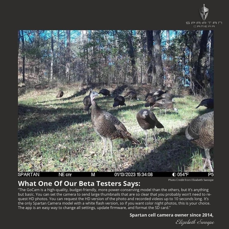 1 x Spartan 4G LTE GoCam 1 x 4G Omni-directional Antenna 1 x Nylon mounting strap 1 x Set-up booklet 1 x 4G sim card from either Verizon or AT&T Spartan GoLive 2 4G/LTE Cellular Trail Camera. Verizon. AT&T. Free roaming in multiple carriers(M model). Excellent HD Photos and HD Videos: Sends high-quality images and videos directly to the Spartan Camera Management App and web portal. Our pictures are not artificially enlarged to boost our MP size. Carrier Flexibility. Plus, the Stronger & more reliable signal:Spartan offers the affordable data plan per GB in the industry. REAL DATA only. We don't limit you to a certain number of images/videos. Excellent battery life up to 4 months. GA-Based In-House team available for any questions or concerns. Plus, your data is always private and secure on our US-based servers utilizing AWS technology. Ultimate control at the touch of a button: Remotely update your camera settings with free Spartan app. Share camera access with as many friends,as you want through the Spartan App. All Spartan models are registered by Verizon and AT&T 4G LTE. However, when you want to get the best signal, Spartan Multi-carrier offers smart carrier switching. It means no more worries on signal. Easily access high quality photos and videos through the Spartan Camera Management app. Update settings in near-real time and share camera access with friends, family, and coworkers at no extra cost. Spartan offers REAL DATA rather than by photos. Request HD photos and videos at no extra cost. Even with our lowest plan, you can get up to 10,000 thumbnail images. Excellent HD Photos and HD Videos: Sends high-quality images and videos directly to the Spartan Camera Management App and web portal. Our pictures are not artificially enlarged to boost our MP size. Carrier Flexibility. Plus, the Stronger & more reliable signal:Spartan offers the affordable data plan per GB in the industry. REAL DATA only. We don't limit you to a certain number of images/videos. Excellent battery life up to 4 months. GA-Based In-House team available for any questions or concerns. Plus, your data is always private and secure on our US-based servers utilizing AWS technology. Ultimate control at the touch of a button: Remotely update your camera settings with free Spartan app. Share camera access with as many friends,as you want through the Spartan App. All Spartan models are registered by Verizon and AT&T 4G LTE. However, when you want to get the best signal, Spartan Multi-carrier offers smart carrier switching. It means no more worries on signal. Easily access high quality photos and videos through the Spartan Camera Management app. Update settings in near-real time and share camera access with friends, family, and coworkers at no extra cost. Spartan offers REAL DATA rather than by photos. Request HD photos and videos at no extra cost. Even with our lowest plan, you can get up to 10,000 thumbnail images. Carrier Flexibility. Plus, the Stronger and more reliable signal at affordable cost. All Spartan Camera models are officially registered to work on the Verizon and AT&T 4G/LTE networks. However, when you want to be sure you get the Stronger & more reliable signal, we also offer smart-carrier switching on our new GoCam M. The Smart-carrier switching means no more worrying about selecting the best carrier for your camera. It automatically connects to the Stronger and more reliable signal in your area. Need to move your camera to a new property? The camera will change carriers to keep you connected wherever you go in the USA. Simply pick your data options through the Spartan Camera website and never worry about connectivity again. Spartan offers the most affordable data plan per GB in the ndustry. REAL DATA only. We don't limit you to a certain number of images or videos. If you own serval cameras, you can have up to 10 total cameras on our most robust data plans. Add a line to your plan for just an additional 5usd a month per camera. High-Quality Images and Videos Receive high-quality thumbnails directly to your phone and web portal and request full-HD pictures and videos at no extra cost. Our pictures are not artificially enlarged to boost our MP size. What you get is the real deal! Easy Picture and Video Access Quickly and easily access your camera pictures and videos with the Spartan Camera Management App wherever you go. Share Camera Access Share access to your cameras with your friends, family, and coworkers. This is a great feature for planning your next big hunt with a group or for coordinating security or surveillance on a shared property. Real Data Only Spartan offers affordable data plan per GB in the industry. REAL DATA only. We don't limit you to a certain number of images or videos. If you own serval cameras, you can have up to 10 total cameras on our most robust data plans. Add a line to your plan for just an additional 5usd a month per camera. This means that you can use your data how you want with no hidden fees. Request HD photos and videos at no extra cost. Even with our lowest plan, you can get up to 10,000 thumbnail images. Secure cloud storage When searching for our data storage solution, we wanted only the best of the best. That’s why with Spartan, your data is always private and secure on our US-based servers utilizing AWS technology. GA-Based In-House Technical Team & US-based Servers. Spartan Camera was born in Johns Creek, GA. Our camera and mobile app are designed in GA,USA and well manufactured in China. We are here for any questions or concerns. Plus, your data is always private and secure on our US-based servers. Remote Setting Updates Update your camera settings and firmware from the Spartan Camera Management App so you will always have the best features and performance. Do you know? Spartan Gocam is the FIRST 4G LTE trail camera that officially registered by Verizon and AT&T in the industry. Check what our beta testers say: " The GoCam is a high-quality, budget-friendly, more po