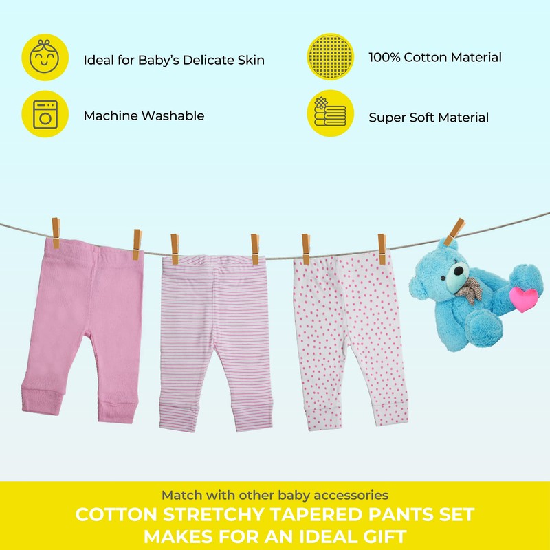 • Size and Other Details: These pink dots tapered pants come in a pack for three assorted colored pants, and with sizes that fit 3, 6, 9, 12, 18 or 24 months old babies.