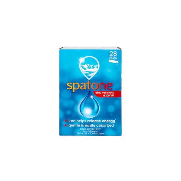 Spatone is 100% natural iron rich water. Sourced from North Wales, it is a daily liquid iron supplement in an easily absorbable form. Spatone sachets are convenient for use on the go, and are your gentle daily iron provider. Iron is an essential mineral that contributes to normal transport oxygen around the body. As the body does not produce iron, it must be provided through the diet.