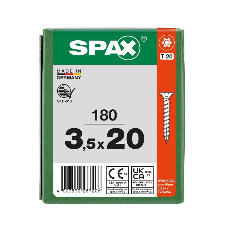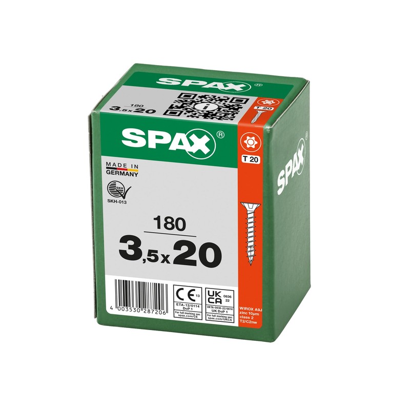 SPAX Wirox 8000000287206 Universal Screw, 3.5 x 20 mm, Pack of 180, Fully Threaded, Countersunk Head, T-Star Plus T20, 4CUT, Wirox